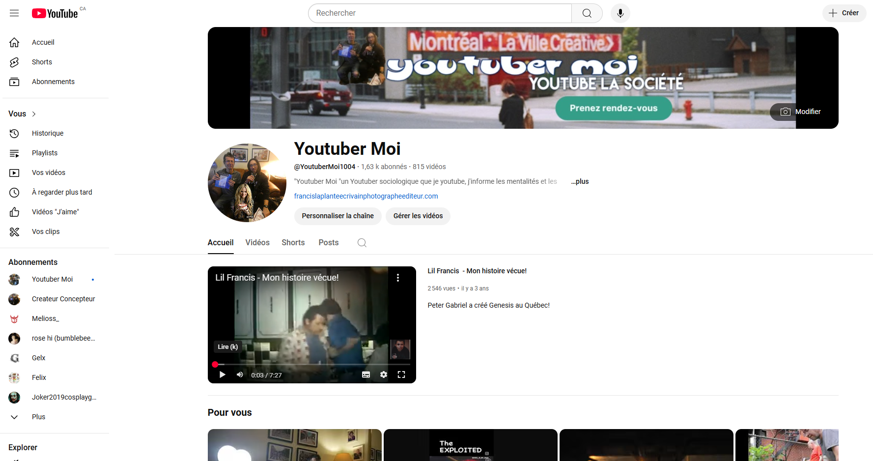Mon site comme Youtuber, je publie mes créations littéraires, artistiques et photographiques. Mes connaissances avec ma communauté dans un format moderne. Contenus uniques et inspirants sur divers sujets, du divertissement mes surtout des conversations avec mes abonné(e)s et mes auditeurs de ma chaines qui résiste au temps et évolue en entrant chez les saints, le saint qu'entre. 50
